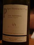Deuxième vin : robe plus dorée. Le nez sur des notes confites est dominé par l'élevage ; beurre, noix de coco, vanille. Bouche d'une grande ampleur, a la matière très douce, presque impalpable, et une acidité en retrait. Le vin est toutefois d'un très bel équilibre. Finale plutôt boisée. Comme ça, j'ai pas l'air très enthousiaste, mais je l'ai plutôt bien aimé, ce vin. Difficile de donner même le cépage, car cela semble bien mûr (pas de note variétale) et il serait plus facile de donner la marque du tonnelier que du vigneron. Petite stupeur en apprenant que c'est un Puligny-Montrachet 1er cru "les Garennes" 2005 vinifié et élevé par Jean Rickjaert. Ca ressemble pas vraiment à l'idée que je me fais d'un Puligny-Montrachet. Par contre, lorsqu'on sait que le monsieur a longtemps travaillé avec Guffens, on est moins étonné du style.
