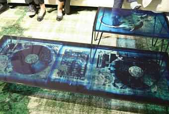 Nous allons plus particulièrement nous intéresser à la création nommée Xradio Disc, une ligne de table basse tendance et dynamique. Son plateau reproduit par radiographie deux platines de DJ, symbole de fête, de détente, de joie de vivre. Le plateau est constitué d’une pellicule imprimée englobée dans une plaque de verre permettant de créer un superbe jeu de lumière et lui confère une solidité à toutes épreuves.