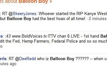 Dans la même journée Bing annoncait de la même manière l’accord passé avec Twitter via un article sur un des blogs de son site officiel. Tout comme Google, l’équipe de Bing relate dans son article les évolutions de la recherche en temps réel et les avantages d’un système tel que Twitter ainsi que l’intérêt notoire d’y participer en l’incorporant dans ses résultats de recherche. Bing précise néanmoins que la recherche de Tweets n’est disponible pour le moment qu’en Beta Test aux Etats-Unis. Voici cependant à quoi ressemblerait une recherche à propos du maintenant devenu célèbre « Balloon Boy » cet enfant qui avait attiré toute l’attention des américains durant de longues heures qui le croyaient bloqué dans un ballon expérimental :