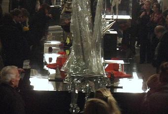Au début, on ne sait que penser : un podium de défilé de mannequins noir et brillant, une cohorte de fantômes en draps blancs, un toréador moribond au sol, et, juste à l’entrée, cette sculpture en cristal hérissée vers le ciel et impossible à photographier, qui dépasse en laideur à peu près tout ce que j’ai jamais vu, excepté sur des aires d’autoroute (The Messiah’s glAss). J’étais tout prêt à faire demi-tour, à peine retenu par la beauté des lieux et par la densité des gigantesques sérigraphies de Ballroom Dancers de Valérie Belin sur ma gauche. Cette exposition, dont le commissaire est, paraît-il, un homme de rock, de danse et de confection, privilégie le grandiloquent, voire le grand-guignolesque. Se succèdent ainsi sur le podium des sculptures toutes aussi pompeuses les unes que les autres.