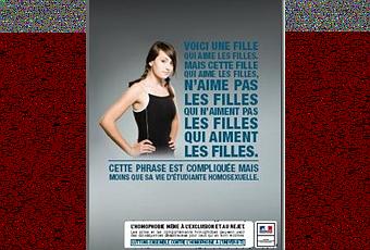 « Voici une fille qui aime les filles. Mais cette fille qui aime les filles n’aime pas les filles qui n’aiment pas les filles qui aiment les filles. » Sous l’égide du Ministère de l’enseignement supérieur et de la recherche, cette campagne (contre l’exclusion et le rejet liés à l’homophobie) incite à réfléchir sur la « vie compliquée » des étudiant(e)s homosexuel(le)s (une affiche analogue existe avec un garçon aimant les garçons). Le paradoxe ? C’est de dénoncer dans un message publicitaire le style alambiqué de ce message lui-même : « Cette phrase est compliquée mais moins que sa vie d’étudiante homosexuelle » commente l’affiche. En fait, le texte s’éclaircit en lui appliquant des parenthèses, comme dans un échafaudage d’opérations, en mathématiques : « Cette fille [qui aime les filles] n’aime pas les filles [qui n’aiment pas les filles [qui aiment les filles]]. » Le problème, c’est que cette réduction sémantique (basée sur une discrimination entre proposition principale et propositions subordonnées) débouche sur un cœur de texte manifestement contradictoire avec le message : « Cette fille n’aime pas les filles ». Effectivement, l’amour c’est (très) compliqué…