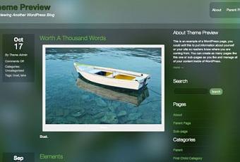 Un thème très vert avec du texte qui s’affiche en blanc sur fond vert. Le flou du fond est très élégant et me fait penser au mot ‘bokeh’ (zone floue à cause de la mise au point / profondeur de champ sur certains clichés). La photo d’une feuille de rosier sous la pluie décore le pied des pages.