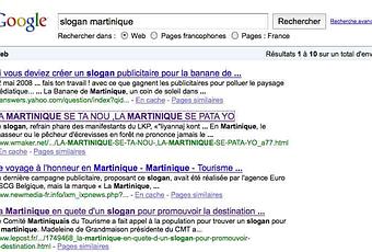 Il suffit de taper "slogan martinique" et le résultat est sans appel, en 2ème position... A propos de slogan, l'opération "trouvons un slogan pour le CMT ": Clôture le 30 novembre à minuit heure locale. Merci pour les nombreuses contributions sur [email protected]
