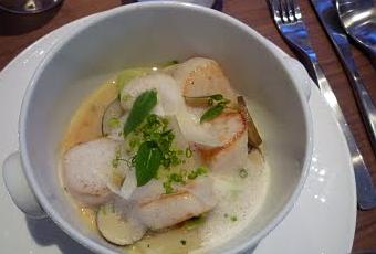 Le plat est servi en cocotte individuelle. Le couvercle se soulève pour faire apparaitre des noix de Saint-Jacques parfaitement saisies, nageant au milieu de fines tranches de radis noirs dont le piquant amer est atténué par une émulsion de litchee. L’impression est douce et légère. La cocotte prépare tranquillement le passage au dessert.