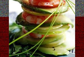 Il n'y a plus qu'à s'amuser à monter les assiettes, de la pomme 2 ou 3 lamelles, de l'avocat 1 tranche, des crevettes… et on recommence deux fois en finissant par les crevettes. On arrose alors avec les herbes hachées, avec l'huile restante et la sauce soja, finissez en salant et poivrant. Attention les édifices sont souvent fragiles !