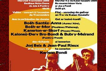 Autour de la lecture en breton de textes de Loeiz Herrieu, Yann-Ber Kalloc'h et Emile Masson par Jorj Belz et Jean-Paul Rieux , les 4 chorales (170 choristes) Boeh Santez Anna, , Kaloneù Derv Bro Pondi & Bubri-Melrant , Kanerion er Skorv et Boeh er Mor, interprèteront une quinzaine de chants en langue bretonne en lien avec l'histoire des Bretons pendant la 1ère guerre mondiale ; les chanteurs et récitants seront aussi accompagnés par les sonneurs de la Kerlenn Pondi.