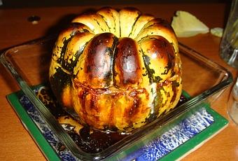 O, après quelques recherches sur internet, m’apprend qu’en français, cette courge s’appelle patidou et elle déniche une recette (qui ressemble à ça ou ça) de patidou farci à la crème et au jambon.