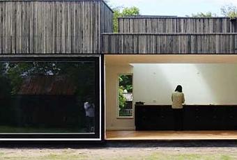 Cette maison minimaliste propose une large pièce de vie et 2 chambres. En façade, un fin bardage vertical de chêne traité gris et sombre rythme les parois. De grandes baies coulissantes ouvrent les espaces sur l’extérieur. La toiture fait elle figure de cinquième façade. Sculpté, travaillé dans sa forme et ses hauteurs, le plafond intègre de larges « skyboxes » qui offrent ventilation naturelle, volume, lumière et vue zénithale. Traversant la maison en diagonale, un couloir ouvert donne perspective et profondeur.