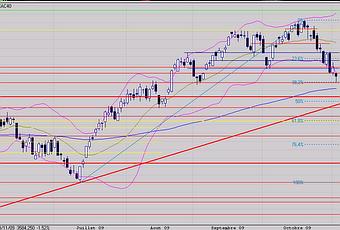 Cette baisse, nous l'avons donc normalement eue ce jour et c'est le support des 3550 points qui a pleinement joué son rôle. Il correspond également au retracement de 38% de la hausse d'été. Ce niveau, comme je l'ai signalé à plusieurs reprises, représente vraisemblablement la 1ère cible de cette correction et on peut penser que c'est à partir de ce niveau qu'un rebond de la correction en cours est en construction surtout que la bougie de ce jour forme un marteau.