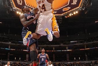 Westbrook peut prendre ses responsabilités et est clairement un meneur de très grand talent. Je dois avouer que je n’ai jamais fais attention au Thunder la saison passée mais après avoir regardé la seconde période contre les Blazers, leur meneur m’a assez impressionné. Avec un 8/12 au shoots, en faisant mal dans tout les domaines, un premier pas très rapide et un shoot fiable, Russell vient de sortir un énorme match pour tenir son équipe à flot tandis que leur leader œuvrait pour une association caritative ( 3/21 aux shoots ). Ses coast-to-coast sont très rapides et la reconversion défensive de Portland a assez souffert dans ce domaine. Fisher risque donc d’avoir du mal face à l’ancien d’UCLA. Le Laker n’a pas encore eu un seul match au dessus des 50% aux shoots, il est le starter qui score le moins et ne donne pas énormément d’assists. Vous l’aurez compris, Fish’ n’est pas en forme. Bien sûr, il continue d’apporter quelque chose, par sa science du basket, sa connaissance du triangle et son expérience. Côté défense, on peut dire qu’il n’est pas trop mal. Il n’a jamais éteint un joueur mais il ne permet pas à ses adversaires de scorer 40 points. Sefolosha sait que la mission sera dure ce soir face à Kobe. Le MVP des dernières Finals vient de sortir son meilleur match offensif de la saison avec 41 points – son 97ème match à 40+ points. Plusieurs Lakers’ fan ont critiqué le manque de forme du leader et les moves qu’il aura montrés face aux Hawks aura fait taire les septiques. Malgré tout, on peut lui reprocher ses lacunes défensives face à Jonhson dans le premier quart-temps. On sait que Kobe est un très grand défenseur. Quand il le souhaite. Or il a laissé faire Joe ce qu’il voulait dans les douze premières minutes. On peut parler d’un manque de jus peut-être. Mais son envie défensive est revenue petit à petit et il a fini avec 5 steals, permettant à son équipe de jouer pas mal de contre-attaque, ce qui aura fait la différence dans le troisième quart-temps. Pour en revenir au seul suisse évoluant en NBA, son rôle sera de se donner à fond en défense. Il a déclaré « Vous ne pouvez rien faire face à Kobe, juste rendre ses shoots plus difficile avec une main devant son visage ou près de sa main de shoot « . Plus facile à dire qu’à faire certainement puisque Kobe risque de lui rendre la vie très dure.