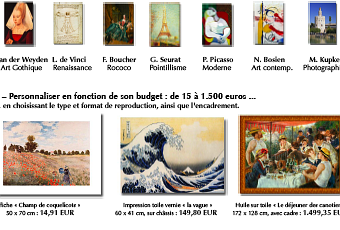 Pour les fêtes de fin d'année, vous pouvez être original et offrir un cadeau unique, fabriqué sur mesure, qui pourra être adapté aux goûts de chacun. En effet, Repro-tableaux.com (http://www.repro-tableaux.com) fabriquera, à la commande et selon les paramètres que vous nous aurez indiqués, des reproductions de tableaux, soit par impression numérique, soit peintes à l'huile sur toile. Le catalogue d'images est très large (100.000 tableaux et 70.000 photographies) et les possibilités de personnalisation sont infinies.