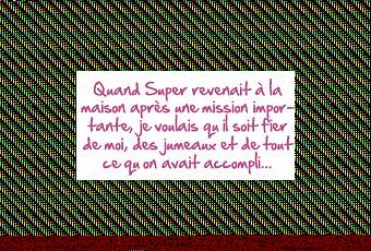 SuperWoman, raisonnable – Super était très reconnaissant de ma façon de m’investir dans ma vie familiale. Il me disait souvent que j’étais la meilleure douce moitié du monde. Surtout, n’allez pas croire que le fait qu’il porte un costume si ajusté fait de lui un homme rose. Il est un homme de sa génération qui préfère laisser aux femmes l’éducation des enfants, le ménage et la cuisine. Fidèle à son modèle familial, il pourvoyait à nos besoins financiers. Il s’impliquait peu dans les soins à donner aux enfants et dans l’entretien ménager. Je n’avais pas beaucoup d’aide.