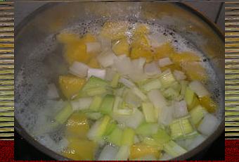 Épluchez les légumes, et coupez-les en morceaux. Faites-les cuire dans un grand volume d'eau bouillante. Ajoutez d'abord les pommes de terre, et ajoutez les courgettes en dernier.