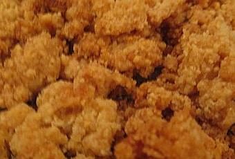 Pour le crumble (les miettes), je mélange 120 g de farine, 120 g de poudre d'amandes, 100 g de cassonade et J'ajoute 120 g de beurre très froid, je fait les miettes à la mains, pour en avoir des grosses, ensuite je les dépose sur une plaque couverte de papier siliconé, et au four pour une dizaine de minutes (th° 180°), il faut qu'elles soient bien dorées.