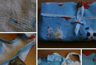 biais maison, appliqué initiale du bébé, pochette cadeau assorti