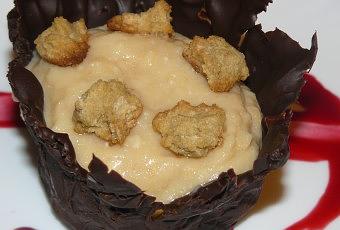 au dernier moment, remplir les corolles en chocolat de crème de coing et parsemer de crumble