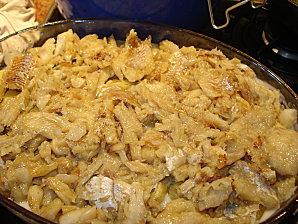 4. Une fois la morue cuite, il faut lui enlever la peau et les arrêtes. Puis l'ajouter aux oignons. Laissez dorer 5 à 10 min.