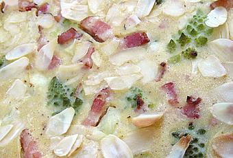 Dans un moule à tarte de 26 cm à bord haut, disposer les choux avec les lardons. Verser la crème aux œufs dessus et parsemer d'amandes.