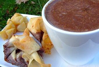 Au moment du goûter, faire réchauffer le lait chocolaté en fouettant puis verser dans les tasses. Servir avec les broutilles tièdes et un peu de compotée froide de pommes restantes.