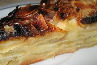Tassez bien (plus les lamelles sont fines mieux c'est) et lissez à la spatule. Enfournez pendant 25 min à 200° (j'ai mis le thermostat à 7) jusqu'à ce que le gâteau soit doré et ferme au toucher.