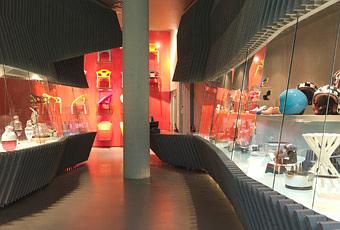 Un lieu qui se découvre comme un voyage initiatique dès l’entrée en forme de canyon où une vitrine en lignes brisées est longue d’une vingtaine de mètres. À partir de là, vous serez attirés par une lumière rouge orangée brillante au bout du couloir. À cet endroit, le voyage continue dans les limbes d’un design plus que mystérieux.