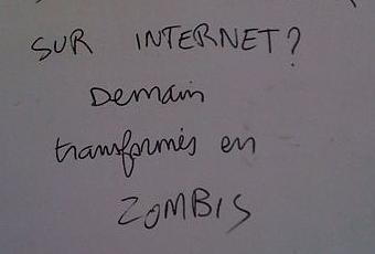 C’était inévitable… Les premiers signes de la future invasion par les machines ayant commencé avec la sortie de l’iPhone et l’expansion planétaire de Twitter, la résistance s’organise. La preuve avec ce joli graffiti bien réac qui respire la vieille économie, la disquette 3,5 pouces et la défaillance orthographique (hé avec un E, le mot zombie).