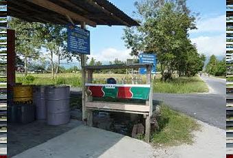 Postés au bord de la route, sous l'auvent d'une épicerie-station-service dont nous sommes l'attraction, nous guettons un bus ou un bemo.