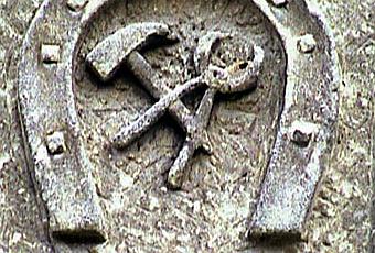 Lionel Royer m'a adressé la photo du claveau sculpté qui se trouve sur la porte cochère d'un ancien atelier de maréchal-ferrant, place de la République, à Saint-Paterne-Racan (Indre-et-Loire). A l'intérieur d'un fer à cheval, on distingue bien les tricoises (tenailles) et le brochoir (marteau à ferrer), placés en sautoir sur un fond de pierre grossièrement bûché.
