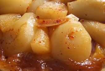 Tatin de poires au sirop de gingembre et piment d'Espelette Il y a quelques jours ou semaines je publiais la recette des poires au sirop de gingembre et piment d'Espelette recette ( clic ) mais étant très en retard dans mes publication celle-ci réalisée pourtant le même jour n'arrive devant vos yeux émerveillés ( non ? ) bon ....alors devant vos yeux tout court qu'aujourd'hui !Recette pour : 6 pers à 8 pers Cuisson : 30 mn à 180 °