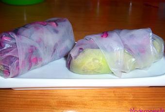 Humidifier une galette de riz, la poser sur un torchon humide (et propre!),déposer un peu des trois garnitures en faisant attention de ne pas mettre de jus sur la galette sinon les rouleaux ne tiendront pas il faut que la garniture soit humide mais pas liquide. Pour le pliage reportez vous sur le paquet des galettes de riz. Renouveler l'opération jusqu'à puisement des ingrédients.