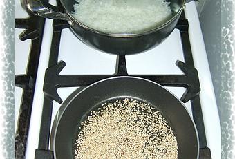 Le riz est cuit, les graines de sésame sont grillées à la poële.