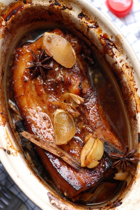 Un Coca mon cochon ?Ingrédients : 650g de poitrine de porc frais en un seul morceau – 15cl de Coca Cola – 15g de gingembre en tranches – 2 étoiles de badiane – 1gousse d’ail écrasée – 1 bâton de réglisse – 1càc de pâte de curry rouge – ½ càc de coriandre en graines grossièrement écrasées – 1càs de miel – 1càs de sauce soja