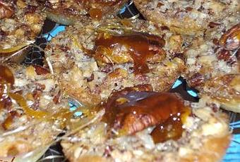 Trempez les cerneaux de noix de pécan dans le caramel avec des cuillères (attention c'est chaud!) et placez un cerneau sur chacune des mini tartes.