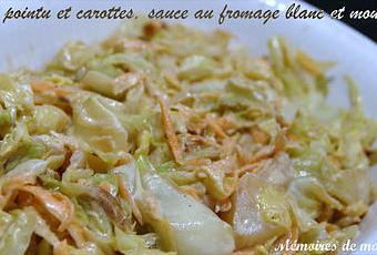 Une recette simple et rapide de chou pointu avec des carottes râpées à peine cuites dans une sauce au fromage blanc et moutarde et quelques grains de carvi. En accompagnement d'une viande blanche, de saucisses ou de pain de viande.
