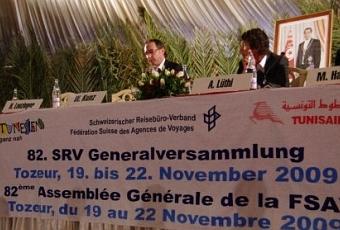 La Fédération Suisse des Agences de voyages (FSAV) a tenu ce week-end à Tozeur (Tunisie) sa 82ème assemblée générale en présence du Ministre du tourisme tunisien M. Khelil Lajimi. Organisation impeccable sous l’égide de l’Office du tourisme tunisien qui s’est surpassé pour concocter un excellent programme qui a remporté l’adhésion des 215 membres de la FSAV qui se sont déplacés à Tozeur avec un avion spécial de la compagnie Tunisair au départ de Zurich et un autre de Genève.