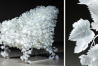 La Ivy Chair du créateur japonais Satoshi Itasaka est recouverte d’un ensemble de petites « feuilles » synthétiques, donnant à l’ensemble un aspect poétique, duveteux et original.