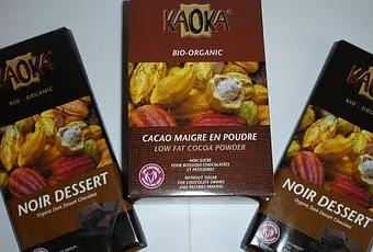 La société KAOKA a été créée en 1993, sous l’impulsion d’André DEBERDT spécialiste dans le développement de programme en Agriculture Biologique dans le monde entier. Une logique d’engagement à long terme, un partenariat étroit avec les producteurs de cacao, une stratégie de développement durable sont les trois piliers de leur démarche. Celle-ci implique : un respect de l’environnement et de sa biodiversité, un respect de la dignité humaine en assurant aux producteurs des revenus décents pour eux et leurs familles, Un engagement qualitatif nécessaire à une politique stable et prometteuse d’avenir. Déguster un chocolat KAOKA doit être un plaisir pour l’esprit et pour le corps ; cela est leur devise.Voici un petit échantillon reçu de leurs produits...J'ai reçue 2 tablettes de chocolat noir dessert bio et 1 paquet de cacao maigre en poudre bio.Kaoka propose également d'autre assortiment de chocolats, donc allez voir leur site si vous aussi vous êtes fans de chocolats, comme moi ;)