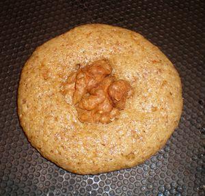 Déposer de petits tas de pâte sur une plaque recouverte de papier sulfurisé, bien espacés, et poser un cerneau sur chaque biscuit.