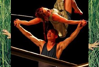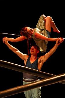 Puis vient la fille. Aérienne. Elle s’élance sur les fils de fer, pieds nus sur le métal. Elle dans les airs, lui retenu à terre, comme si le poids de son être l’attirait irrémédiablement vers le sol. Elle chante sur son fil. A genou. Il la suit, en dessous.