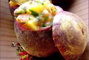 Refrigerate until serving. Just before serving, fill the Passion Fruit rinds with the Salmon tartare.(N.B : The remaining of Passion Fruit pulp can be used to make a coulis.See recipe here.)