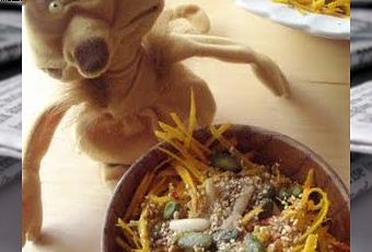 Torréfiez à sec les pistaches et pignons. Incorporez à la salade et saupoudrez de gomasio.