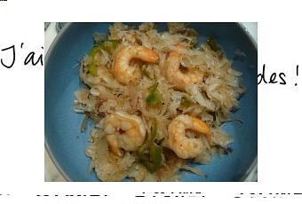 J'aime bien la choucroute traditionnelle de temps en temps surtout en hiver et ce n'est pas forcément un plat lourd si on en mange juste à sa faim : chou, un peu de pommes de terre, une saucisse, un peu de bacon, de jambonneau ou autre selon son goût,... Mais, en fait, ce que je préfère vraiment dans la choucroute, c'est le chou ! Donc, j'étais contente de tomber par hasard sur une vieille recette du magazine Saveurs : wok de crevettes à la choucroute, d'autant que j'avais quelques crevettes au congélateur. C'est très facile à préparer : en gros, on fait revenir du poivron vert et de l'oignon rouge finement émincés, on ajoute les crevettes pour les faire dorer, un peu de sauce soja puis on réchauffe la choucroute et on mélange le tout. Le résultat est délicieux avec une saveur très différente de la choucroute habituelle du fait notamment de la sauce soja et du poivron vert.
