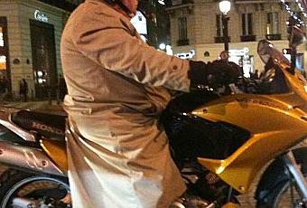 Il arbore sans complexe, une fois de plus, un casque Momo Design dont il ignore la visière et pose sur son gros nez des lunettes d'aviateur tellement vintage, tellement mode, tellement so class...