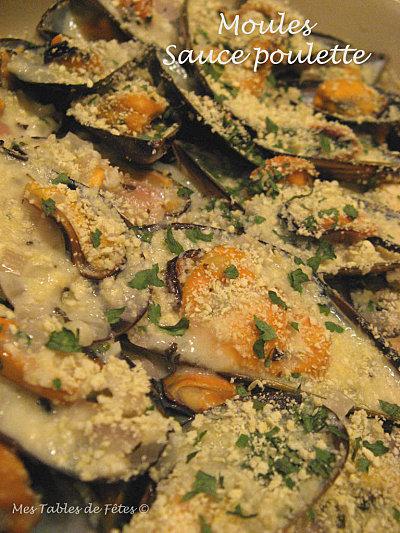 Dans une casserole faire suer l'ail et l'échalote coupés en petits dés dans le beurre. Mouiller du jus de cuisson en quantité suffisante pour couvrir les moules, ajouter la crème, le jus de citron et faire chauffer à feu vif. Délayer la farine dans la sauce tout en remuant et continuer à cuire jusqu'à ce que la sauce épaississe et nappe la cuillère.