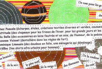 Vous y trouverez, en plus des bijoux, des tissus et des sacs, les pièces de Chez Pascale (accessoires et vêtements en dentelle de mohair), Hattitude (des chapeaux pour les frimas de l’hiver, pour les grands jours et les grands soirs), Lulu Belle (des accessoires en laine feutrée et en soie, de l’humour, de la poésie), Suzanne Vaisset (dentellière dans les règles de l’art), Dominique Limousin (des doudous en folie, une ménagerie qui déménage), Ko’dôba (des tee-shirts afro-urbains pour hommes).