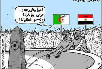 Ce dessin de presse publié dans Al-Quds al-’arabi il y a une semaine fait bien sûr allusion aux suites du match entre l’Algérie et l’Egypte (voir le précédent billet). Jouant sur les différents sens du mot marma (le but mais aussi Marma al-Jamarat, un des rites du pèlerinage où les fidèles « lapident » le diable), les deux supporters échangent les mêmes pensées : Enfin, grâce à Dieu, un but qui nous unit et qui efface nos fautes !