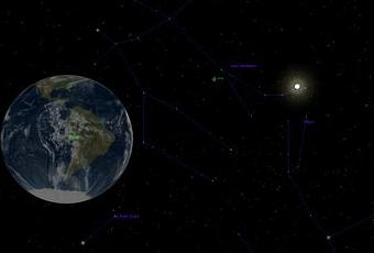 Le logiciel donne une représentation fidèle des positions des planètes, etc...en temps réel ! Aperçu à la date future du 23 juin 2009 à environ 40.000 km de la terre, vue vers le soleil, avec la constellation des gémeaux en arrière-plan, on aperçoit également la lune (cliquez pour agrandir) :
