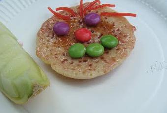 Un des ateliers proposait de faire un DESSERT DE MONSTRE, avec des petits pancakes americans tout pret, un peu de confiture, des smarties et des vers de terre Haribo pour les pattes...V'la 2 chefs d'oeuvre de mes artistes:
