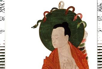 Nâgârjuna, moine bouddhiste du IIe-IIIe siècle originaire de l'Inde, est célèbre pour être le fondateur de l'Ecole philosophique dite du « Milieu ». Sa vie, dont nous ne savons en réalité que peu de choses, nous est rapportée par un important corpus littéraire historique, elle est bien évidemment mêlée de légendes et de mythes d'une richesse caractéristique des hagiographies religieuses traditionnelles. Selon ces sources, Nâgârjuna tiendrait son nom de Nâga qui signifie serpent, et d'Arjuna une variété d'arbre, ce qui, symboliquement, signifierait qu'il soit né sous un arbre et que des serpents furent les instruments de la transmission de sa science et de son savoir. Ayant un jour guéri Mucilinda, le roi des Nâga, ces derniers, en forme de remerciements, lui remirent dit la tradition, les cent mille vers du Prajnâpâramitâ-sûtra. On dit également que dans le palais des Nâga, Nâgârjuna découvrit sept coffres précieux contenant de très nombreux Mahâyânasûtra. En 90 jours il mémorisa les cent mille gâthâ qui résument l'essence de la Doctrine du Prajnâpâramitâ. En forme de respect vis-à-vis de son savoir, et de reconnaissance pour son geste envers leur roi, plus tard, lorsqu'il instruira ses disciples, les mêmes Nâga, feront de leur corps une sorte d'ombrelle afin de le protéger des morsures du soleil et, de l'agression des éléments ; ceci expliquant l'origine des très nombreuses représentations iconographique figurant Nâgârjuna, la tête nimbée de sa protection reptilienne caractéristique.
