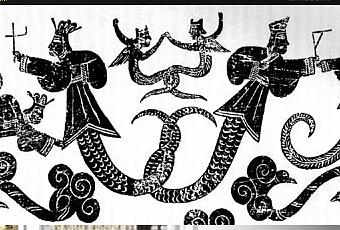 Parmi les coïncidences ou ressemblances qui posent question du point de vue de la symbolique et des traditions, il y a cette représentation assez connue du couple mythologique chinois Fuxi et Nuwa, entrelacés par leurs corps de serpent et tenant en main, lui l'équerre, elle le compas. J'en donne ici quelques reproductions d'après des sources anciennes.
